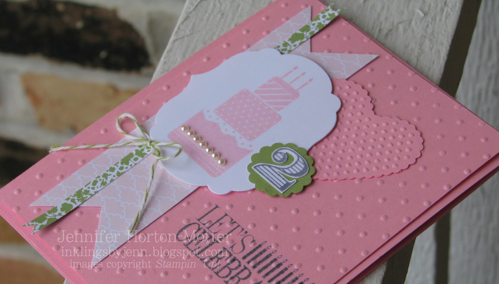 Having the age number on birthday cards for little ones is just too cute, so I stamped and fussy-cut a number 2 (from the Memorable Moments stamp set), and adhered that to a Pear Pizzazz 7/8" Scallop Circle. Technically, the Baker's Twine is Lucky Limeade and not Pear Pizzazz, but I'm hoping Olive won't notice that subtle difference. ;)